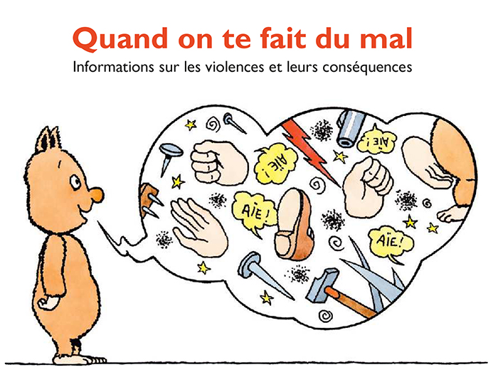 La psychiatre et fondatrice de l’association Mémoire traumatique et victimologie, Dre Muriel Salmona, s’est associée au talent pédagogique de Sokhna Fall afin de créer Quand on te fait du mal, une brochure d’information gratuite et téléchargeable, magnifiée par les dessins du célèbre Claude Ponti. Quand on te fait du mal est un ouvrage fort, très à l’écoute du vécu de l’enfant, à sa portée, lui permettant de comprendre ce qui lui arrive ou ce qui arrive à ses copains et de savoir quoi faire.